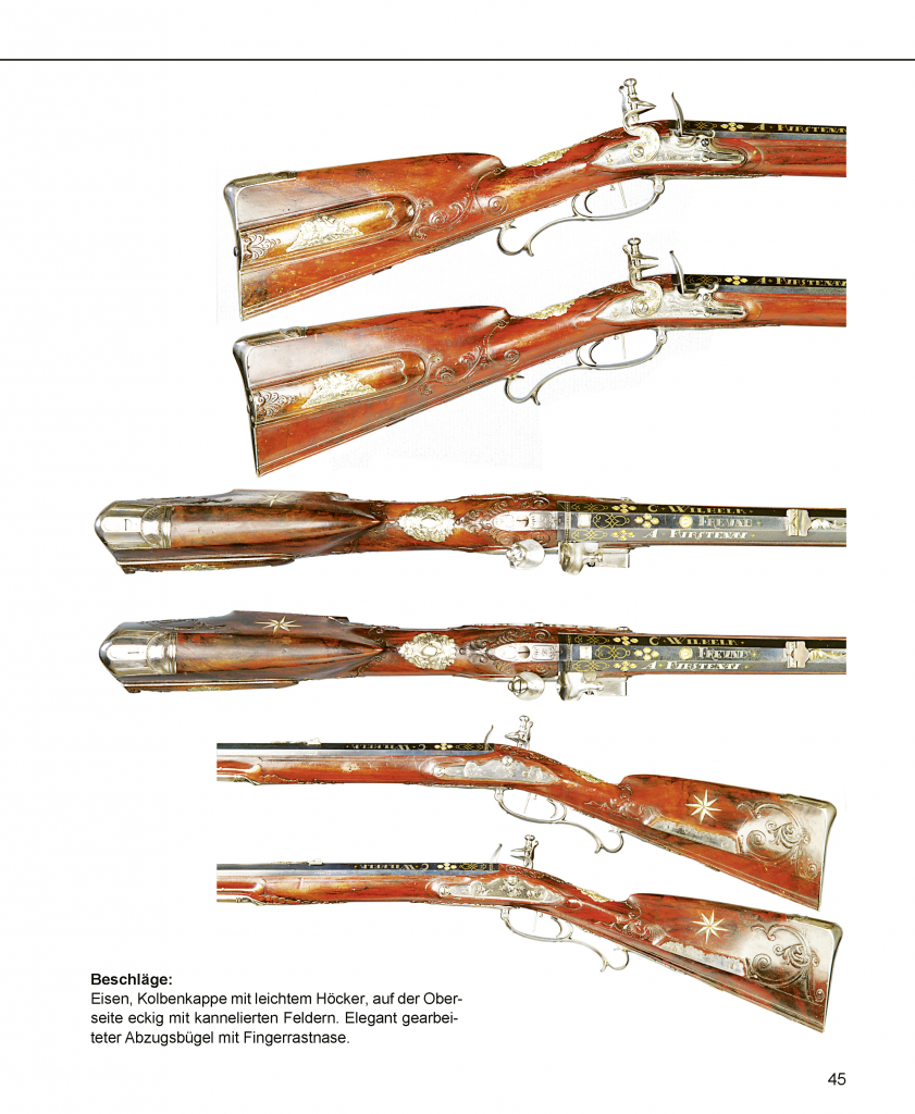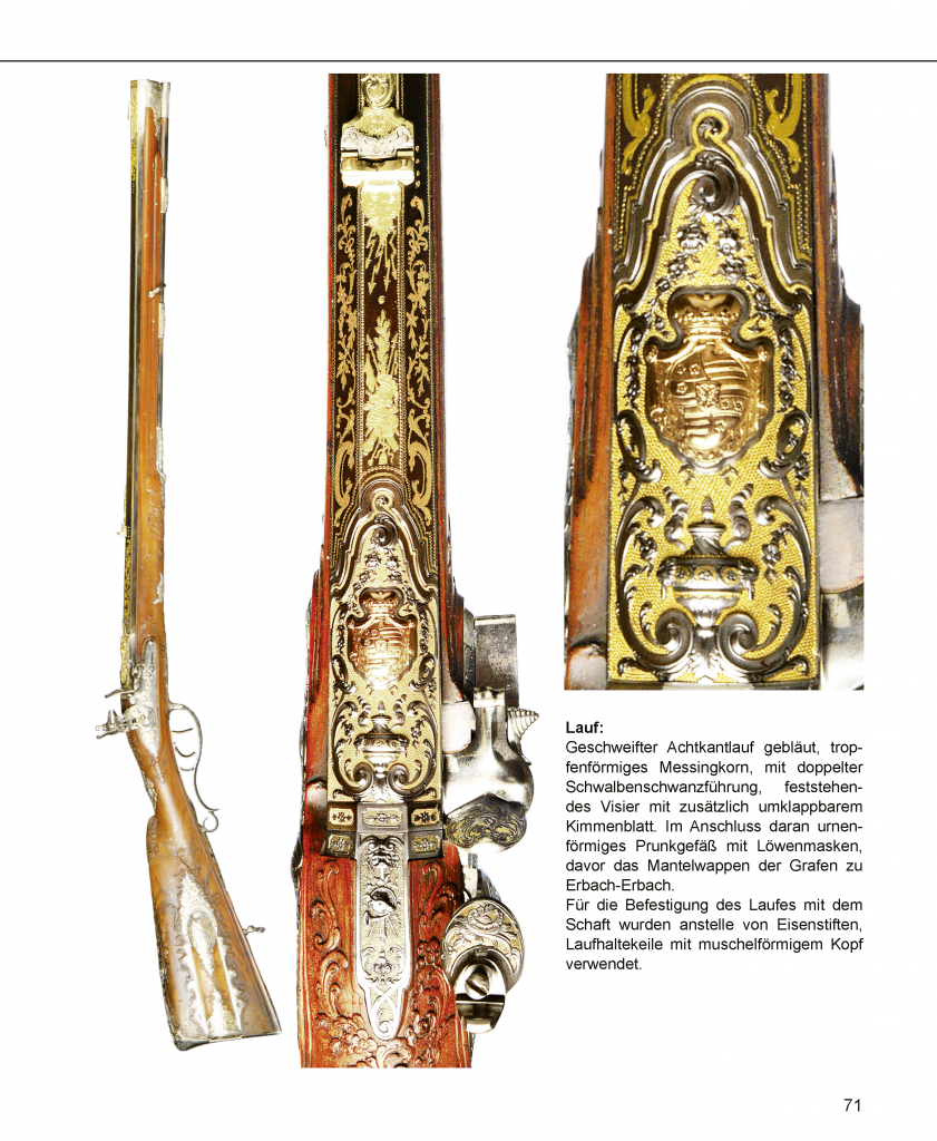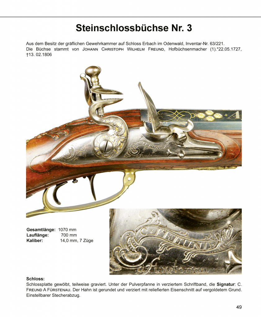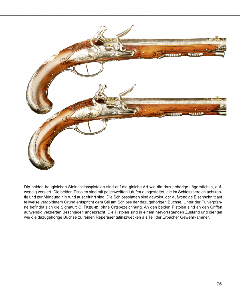 Neben den biografischen Daten dieser genannten Meister und einem Verzeichnis über die in der „Hofgraeflichen Gewehrkammer dahier befindlichen Gewehre und sonstige zur Jagd gehörigen Gegenstände“ sind auch Marken, Stempel und Signaturen an Freund-Jagdfeuerwaffen abgebildet und beschrieben. Im anschließenden Katalog Freundscher-Feuerwaffen werden 10 verschiedene Prunkwaffen aus öffentlichen und privaten Sammlungen auf 50 Seiten vorgestellt. Alle mit detailgenauen Farbaufnahmen und kurzen Beschreibungen versehen.