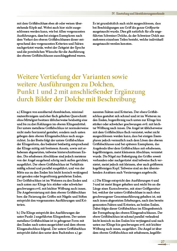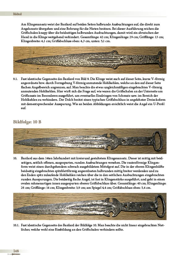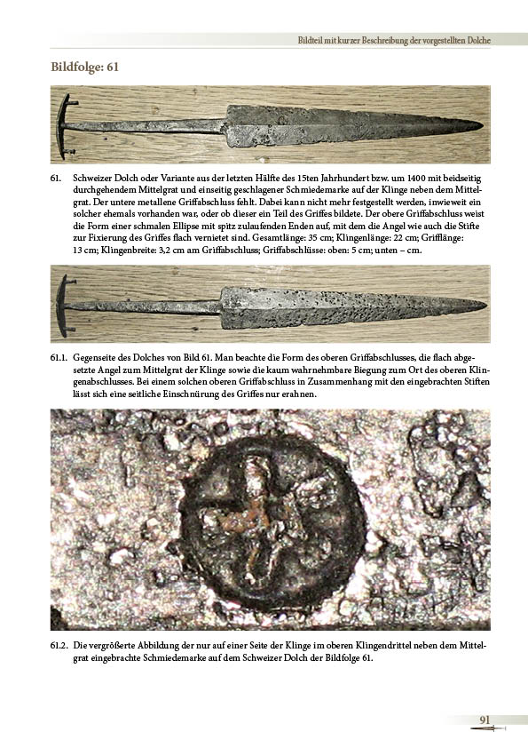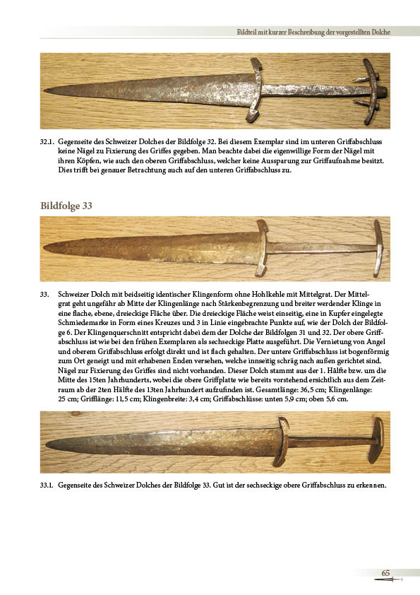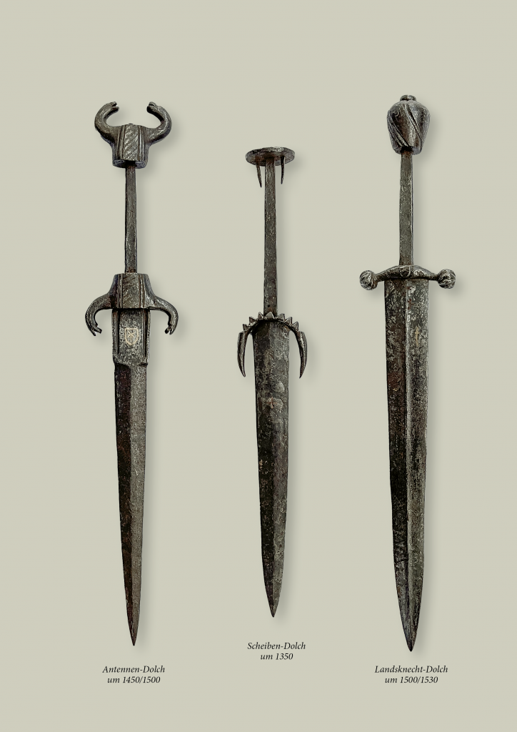In diesem Beitrag soll die Geschichte und Entwicklung der sogenannten Schweizer Dolche angesprochen werden. Von den Anfängen bis zur Renaissance, wobei nur die Dolche behandelt werden, welche dem Ritter oder Söldner zu Diensten waren und nicht als Statussymbol hergestellt wurden bzw. dazu gedient haben. Das bedeutet, hier sollen im I. Teil die Anfänge der Dolche in ihren einzelnen Ausführungen und Varianten angesprochen werden, welche bereits die typischen Merkmale der späteren Schweizer Dolche aufweisen, und auch regional nur dort aufzufinden sind, wo die Schweizer Söldner und Ritter der Region zugegen waren. Der Zeitraum der hier beschriebenen Schweizer Dolchausführungen reicht von seinen Anfängen bis zum letzten Drittel des 16ten Jahrhundert. Der Schweizer Dolch stellt in seiner Bezeichnung bzw. Nennung eine eigene Entwicklung dar, und darf nicht als Baselard, Baseler usw. bezeichnet werden, da die Baselarde, Baseler, Basilarde einen eigenen Dolchtypus darstellen. Der II. Teil umfasst den Basilard bzw. Baselard usw., welcher als einzige Gemeinsamkeit mit dem Schweizer Dolch (Schweizer Degen) das Entstehungsland nämlich die Schweiz mit Umland aufweist, da die Schweiz nicht in heutigen Grenzen zu sehen ist. Vielmehr kann man davon ausgehen, dass die Entstehung der Schweizer Dolche im Kerngebiet des Deutschen Reiches zu suchen ist bzw. im Rekrutierungsgebiet der Schweizer Söldner liegt.